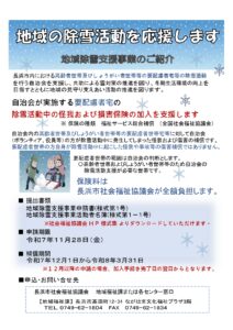 地域の見守り支えあいの活動の推進を図るため、今年度も地域除雪支援事業を実施します。
