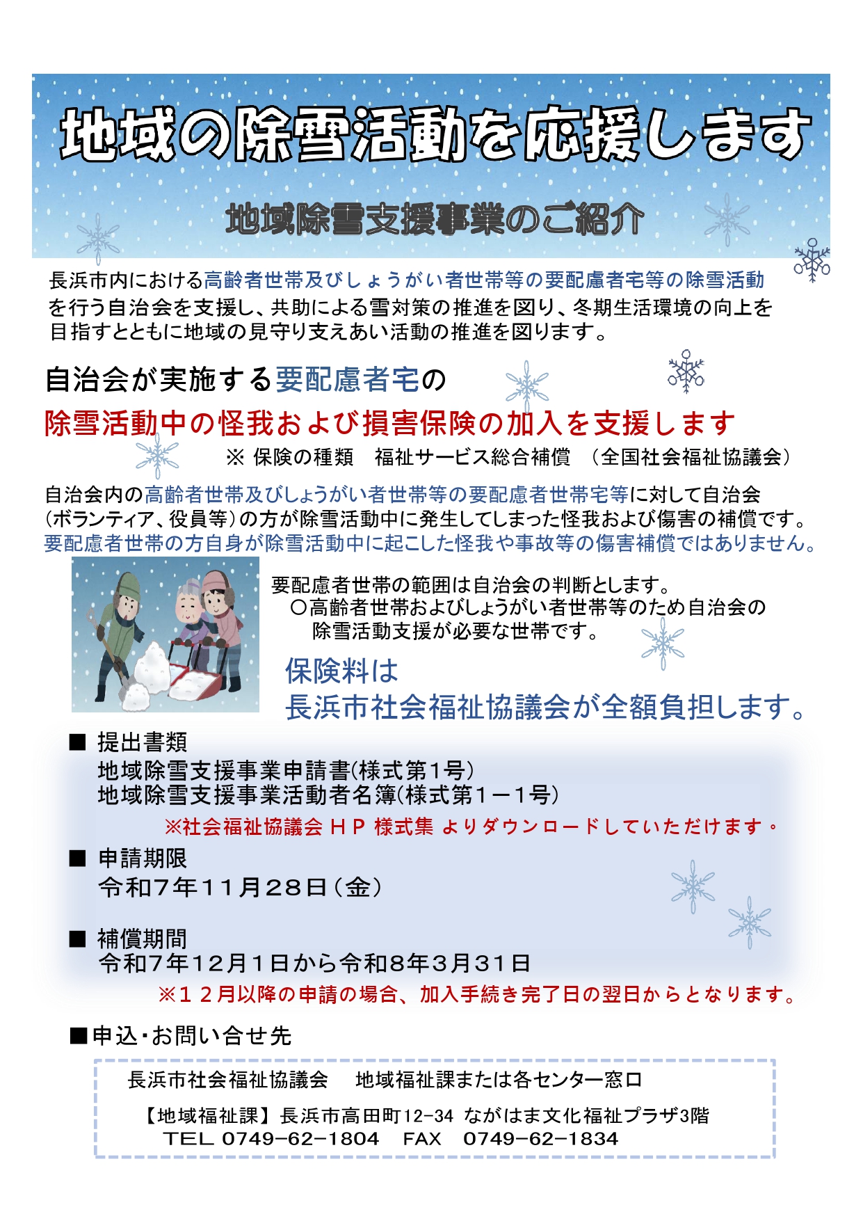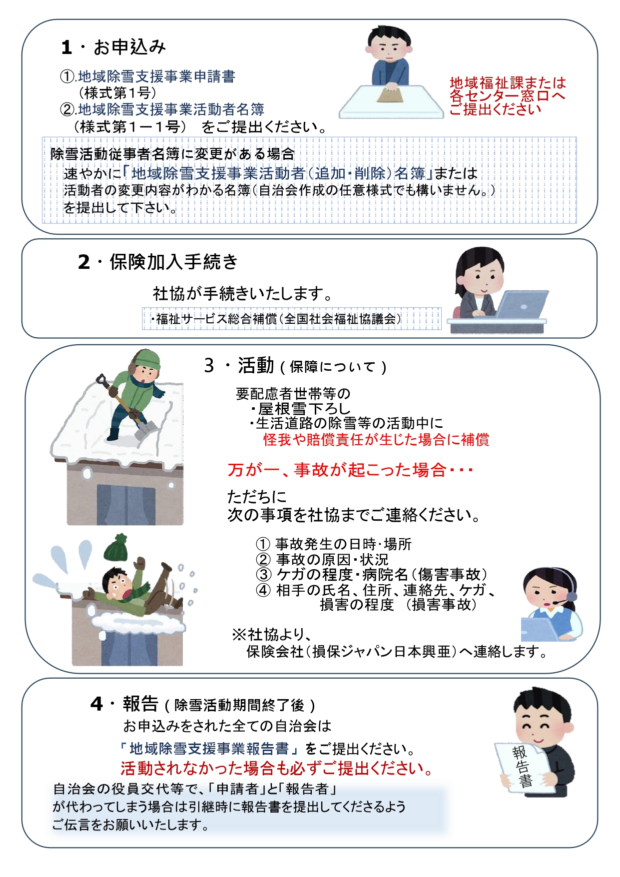 これは、自治会における要援護者世帯の除雪活動に対する万が一の怪我および損害に備え、共助による雪対策の推進を図り冬期生活環境の向上をめざすために実施するものです。