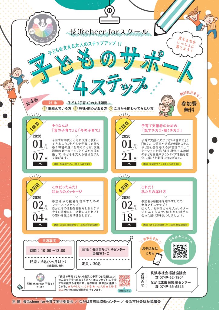 長浜cheer forスクール『子どものサポート4ステップ』 開催します! 「今の子育てを知る」「伝えるチカラを育てる」など、 支援に関わる大人がステップアップできる全4回講座です🌱