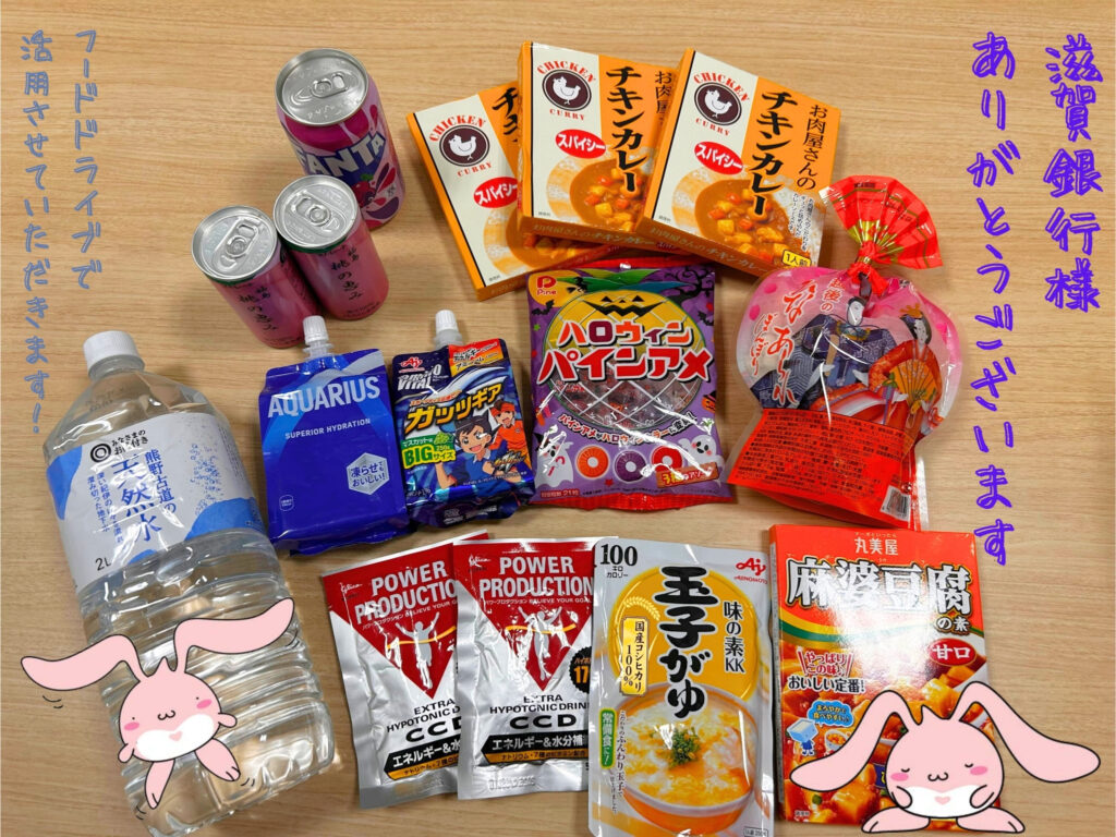 この度、株式会社滋賀銀行様より社員の皆さまの善意から集まった食品等をご寄付いただきました。